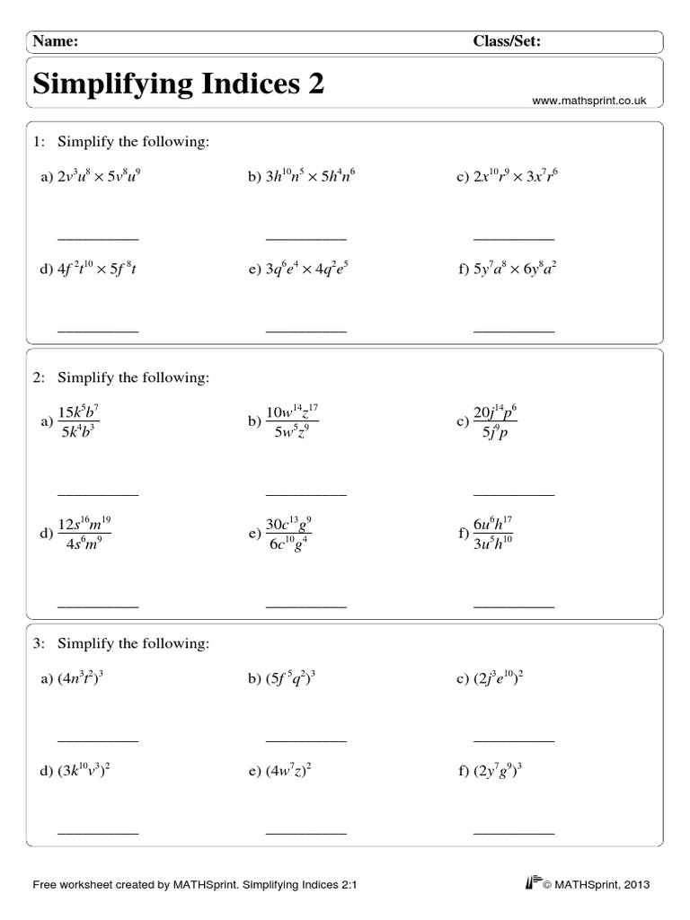 (PDF) Name Class/Set Laws of Indices Free Maths Worksheets · Free Indices Simplifying Worksheet indices rules builds on the 7 rules from powers and roots. simplify the following without the use of a calculator, showing clearly all the steps in your calculations. Read each question carefully before you begin answering it. Whether you want a homework, some cover work, or a lovely bit of extra practise, this. Each section contains a worked.. Indices Simplifying Worksheet.